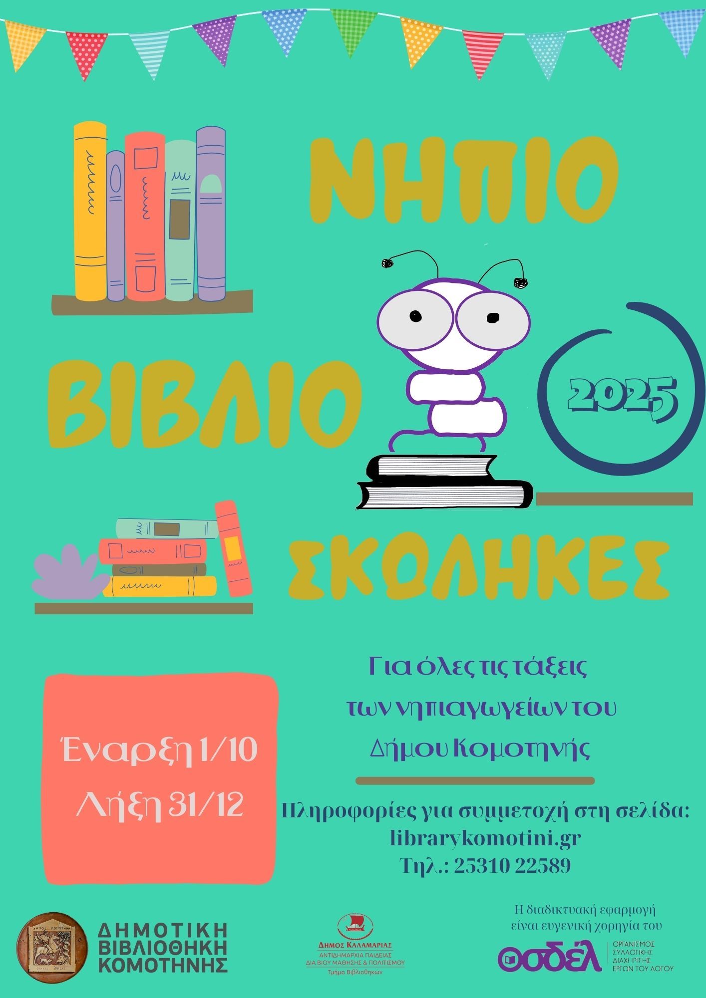 Η Δημοτική Βιβλιοθήκη Κομοτηνής με μεγάλη χαρά ανακοινώνει την έναρξη του προγράμματος φιλαναγνωσίας Νηπιοβιβλιοσκώληκες για το 2025 και προσκαλεί όλα τα Νηπιαγωγεία του Δήμου Κομοτηνής να συμμετέχουν σε ένα τρίμηνο εντατικής ανάγνωσης. Το πρόγραμμα θα διαρκέσει από 7 Οκτωβρίου μέχρι και 31 Δεκεμβρίου 2025 και θα προσφέρει στους μικρούς αναγνώστες την ευκαιρία να καλλιεργήσουν την αναγνωστική τους σχέση με τα βιβλία και να απολαύσουν ποικίλα και ποιοτικά αναγνώσματα της παιδικής λογοτεχνίας. Η διοργάνωση του Προγράμματος Φιλαναγνωσίας «ΒΙΒΛΙΟΣΚΩΛΗΚΕΣ», γίνεται στα πλαίσια του δικτύου συνεργασίας ανάμεσα σε Δημόσιες και Δημοτικές Βιβλιοθήκες της Ελλάδας με στόχο την προώθηση της φιλαναγνωσίας στα σχολεία. Οι Βιβλιοσκώληκες, είναι ένα Πρόγραμμα Φιλαναγνωσίας που ξεκίνησε πριν από έξι (6) χρόνια στην Καλαμαριά. Αποτελεί πρωτότυπη ιδέα και υποστηρίζεται από τις Βιβλιοθήκες του Δήμου Καλαμαριάς. Η διαδικτυακή εφαρμογή του εν λόγω προγράμματος έχει σχεδιαστεί από τον ΟΣΔΕΛ (Οργανισμός Συλλογικής Διαχείρισης Έργων του Λόγου), στο πλαίσιο του πολιτιστικού και κοινωνικού έργου του, και είναι ευγενική χορηγία προς τις Βιβλιοθήκες που συμμετέχουν στο συγκεκριμένο πρόγραμμα. Υποστηρίζεται από τη βάση βιβλιογραφικών δεδομένων bookpoint.gr. Στον παρακάτω σύνδεσμο μπορείτε να δείτε τον ηλεκτρονικό κατάλογο με τα βιβλία του προγράμματος: https://opac.librarykomotini.gr/cgi-bin/koha/opac-shelves.pl?op=view&shelfnumber=39&sortfield=title Διαδικασία συμμετοχής στο πρόγραμμα: 1. Οι δηλώσεις συμμετοχής των Νηπιαγωγείων γίνονται αποκλειστικά και μόνο από τον/την υπεύθυνο εκπαιδευτικό του τμήματος, συμπληρώνοντας την παρακάτω ηλεκτρονική φόρμα. https://forms.gle/Y7YL37HF6iwWWE316 Δηλώσεις συμμετοχής 1-31 Οκτωβρίου 2025. Αφού γίνει η εγγραφή των τμημάτων των Νηπιαγωγείων από του εκπαιδευτικούς στη συνέχεια δικαίωμα συμμετοχής έχουν όλοι οι μαθητές των Νηπιαγωγείων. 2. Οι εκπαιδευτικοί εγγράφονται παράλληλα στην ηλεκτρονική βάση βιβλίων https://bookpoint.gr/bookworms, για να παρακολουθούν τις αναγνώσεις των μαθητών τους. 3. Οι μαθητές πραγματοποιούν την εγγραφή τους στη διαδικτυακή εφαρμογή https://bookpoint.gr/bookworms και κάθε φορά που ολοκληρώνουν την ανάγνωση ενός βιβλίου, το δηλώνουν στη λίστα Διαβασμένα (Νηπιοβιβλιοσκώληκες) και για να θεωρείται έγκυρη η συμμετοχή τους, καλούνται να διαβάσουν από τα βιβλία της προτεινόμενης λίστας που αντιστοιχεί στην τάξη τους. Η δήλωση των βιβλίων στην διαδικτυακή εφαρμογή https://bookpoint.gr/bookworms ΒΙΒΛΙΟΣΚΩΛΗΚΕΣ 2025 είναι υποχρεωτική. Σε διαφορετική περίπτωση η συμμετοχή θεωρείται άκυρη. 4. Ονομαστικοί έπαινοι και αναμνηστικά δώρα θα απονεμηθούν στα παιδιά και στους εκπαιδευτικούς που θα λάβουν μέρος στο 1ο Πρόγραμμα Φιλαναγνωσίας για τα νηπιαγωγεία, Νηπιοβιβλιοσκώληκες 2025. Μπορείτε να αναζητήσετε όλες τις πληροφορίες για το πρόγραμμα, όπως και τη λίστα με τα προτεινόμενα βιβλία στην ηλεκτρονική σελίδα των Βιβλιοθηκών https://librarykomotini.gr/index.php/el/ Βιβλιοσκώληκες – Δίκτυο Βιβλιοθηκών για την προώθηση της φιλαναγνωσίας στα σχολεία Ένα δίκτυο συνεργασίας έχει αναπτυχθεί ανάμεσα σε Δημόσιες και Δημοτικές Βιβλιοθήκες της Ελλάδας με στόχο την προώθηση της φιλαναγνωσίας στα σχολεία (νηπιαγωγεία, δημοτικά, γυμνάσια). Οι Βιβλιοσκώληκες, είναι ένα Πρόγραμμα Φιλαναγνωσίας που ξεκίνησε πριν από έξι (6) χρόνια στην Καλαμαριά. Αποτελεί πρωτότυπη ιδέα και υποστηρίζεται από τις Βιβλιοθήκες του Δήμου Καλαμαριάς.